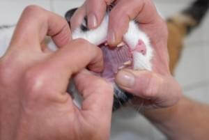 Cet examen porte en particulier sur les dents, avec une appréciation de la quantité de tartre et de ses conséquences (gingivite, dents déchaussées ou mobiles) ; le vétérinaire peut alors conseiller un détartrage. Des lésions des muqueuses buccales (ulcérations, etc.), une mauvaise haleine sont également recherchées.