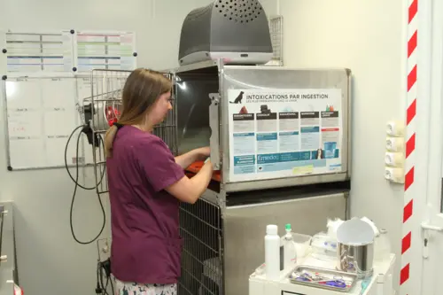 Nous sommes en mesure de répondre aux situations d'urgence vitale : nous sommes équipés de deux unités de production autonome d'oxygène, de pompes à perfusion, de pousse-seringues, de moyens de monitorage (respiration, pulsations cardiaques, tension artérielle, ionogramme...) et d'un chariot regroupant les médicaments d'urgence. La chirurgie d'urgence peut être pratiquée sur place afin de stabiliser l'animal.