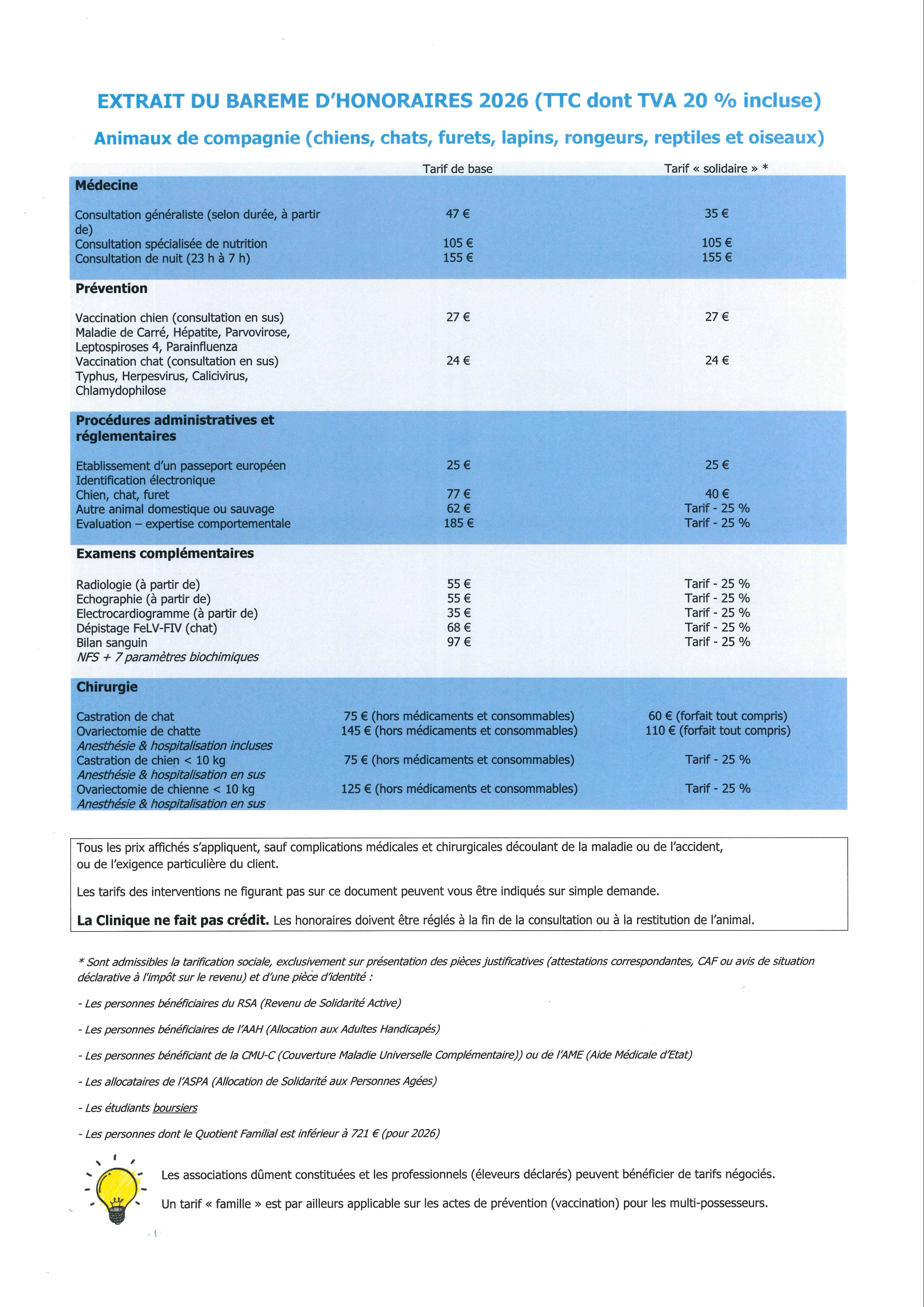 Les tarifs d'une sélection d'actes et de services sont affichés dans le hall de la clinique et ci-dessous. Les autres tarifs peuvent être obtenus sur demande à l'accueil de l'établissement. Les devis sont réalisés à l'occasion d'une consultation, afin d'être le plus précis possible et de correspondre à la réalité du besoin de soins (variables liées au poids, aux contraintes anesthésiques, à la complexité de l'acte, au temps passé...).